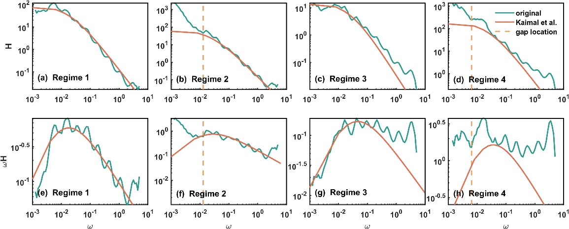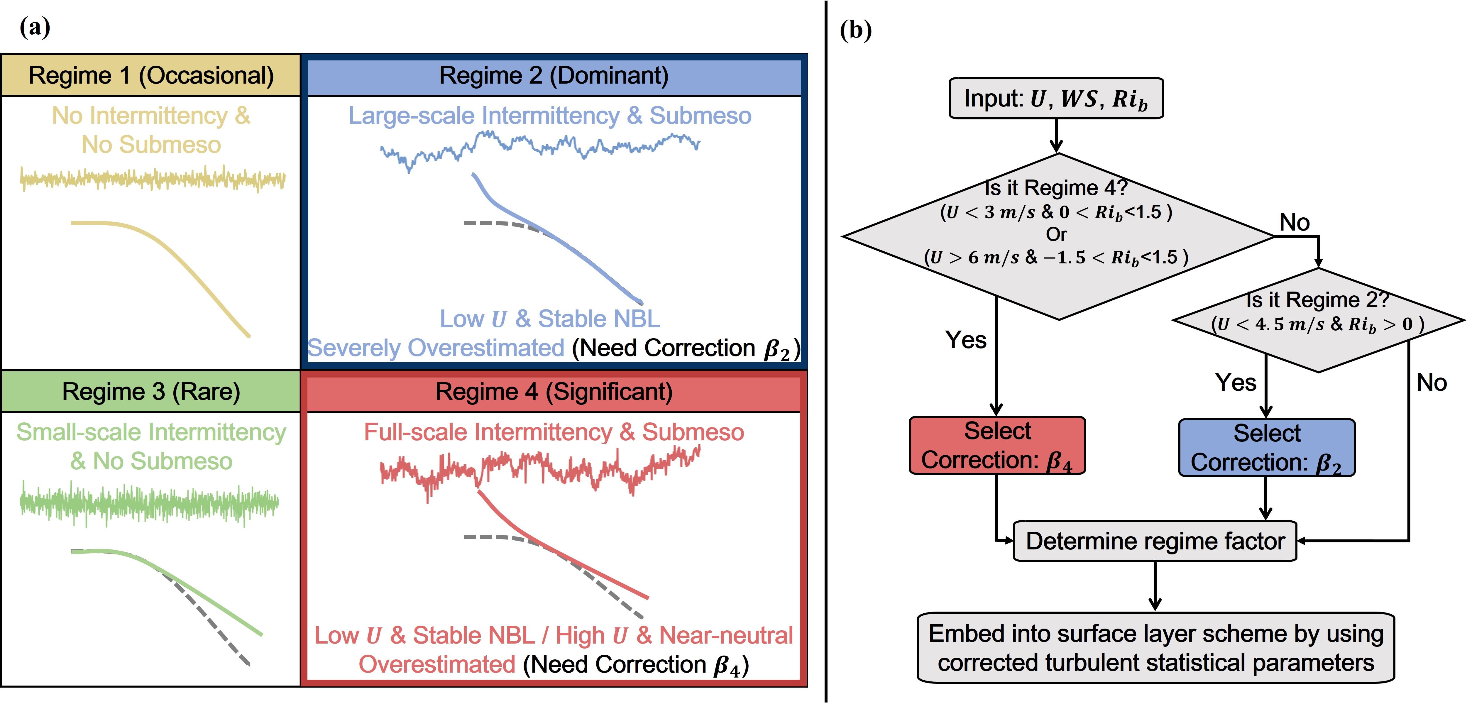 其次,研究团队从湍流微观结构特征出发,区分和识别无湍流间歇性、大尺度湍流间歇性、小尺度湍流间歇性和全尺度湍流间歇性四类典型状态,揭示了次中尺度运动及不同尺度湍流间歇性对相似理论适用性的影响。研究结果显示:在去除次中尺度运动成分后,近地面层风速、温度等湍流统计结构更符合经典相似性理论;据此,建立了次中尺度运动与理查森数的经验性参数化关系,为改进边界层湍流表征提供了新依据(Kang, Ren* et al., JGR, 2025)。