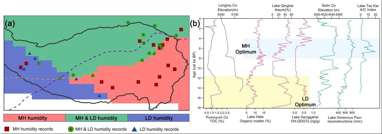 图3 青藏高原湖泊演化“双峰模式”的空间分布格局。(a)虚拟湖泊模拟结果与代用指标记录所反映的“双峰模式”空间分布;(b)青藏高原不同气候适宜期湖泊代用指标记录的变化。