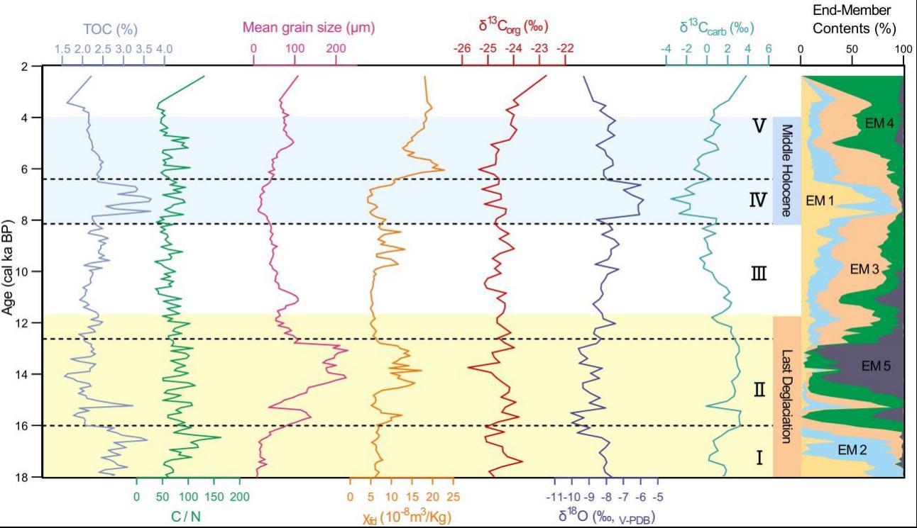 图2 YHZ剖面自末次冰消期以来的沉积学与地球化学指标特征。