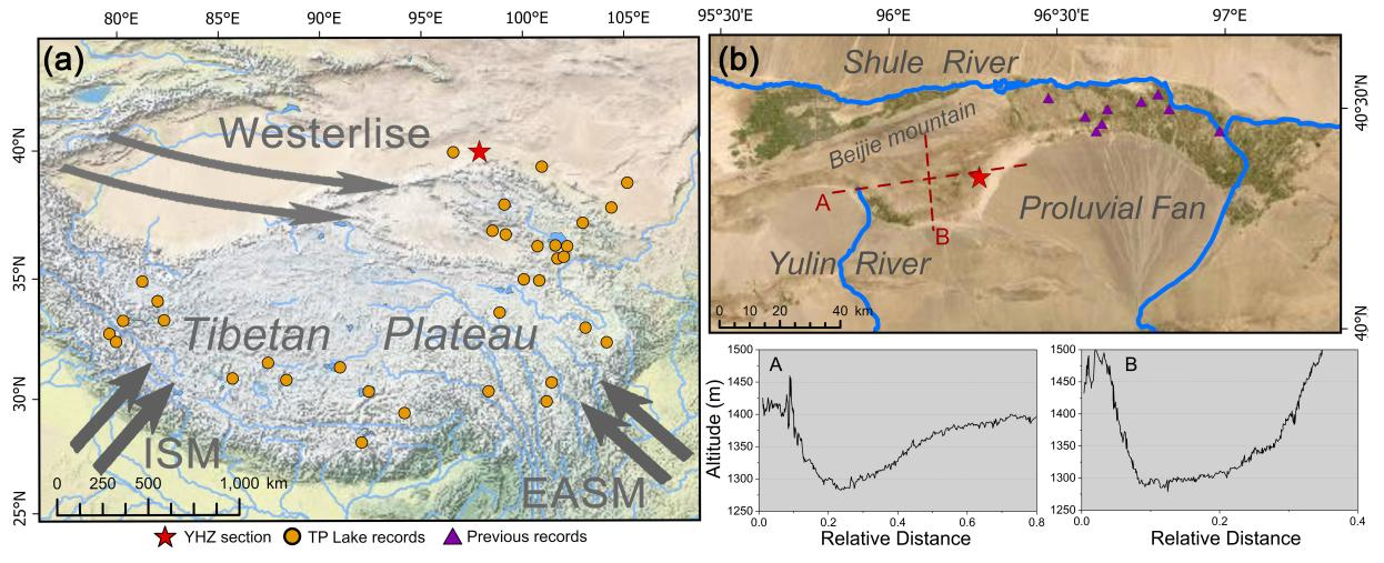 图1 研究区与采样点位置。(a)青藏高原YHZ剖面和典型湖泊记录的分布;(b)疏勒河流域概况以及虚线A、B对应的高程剖面。