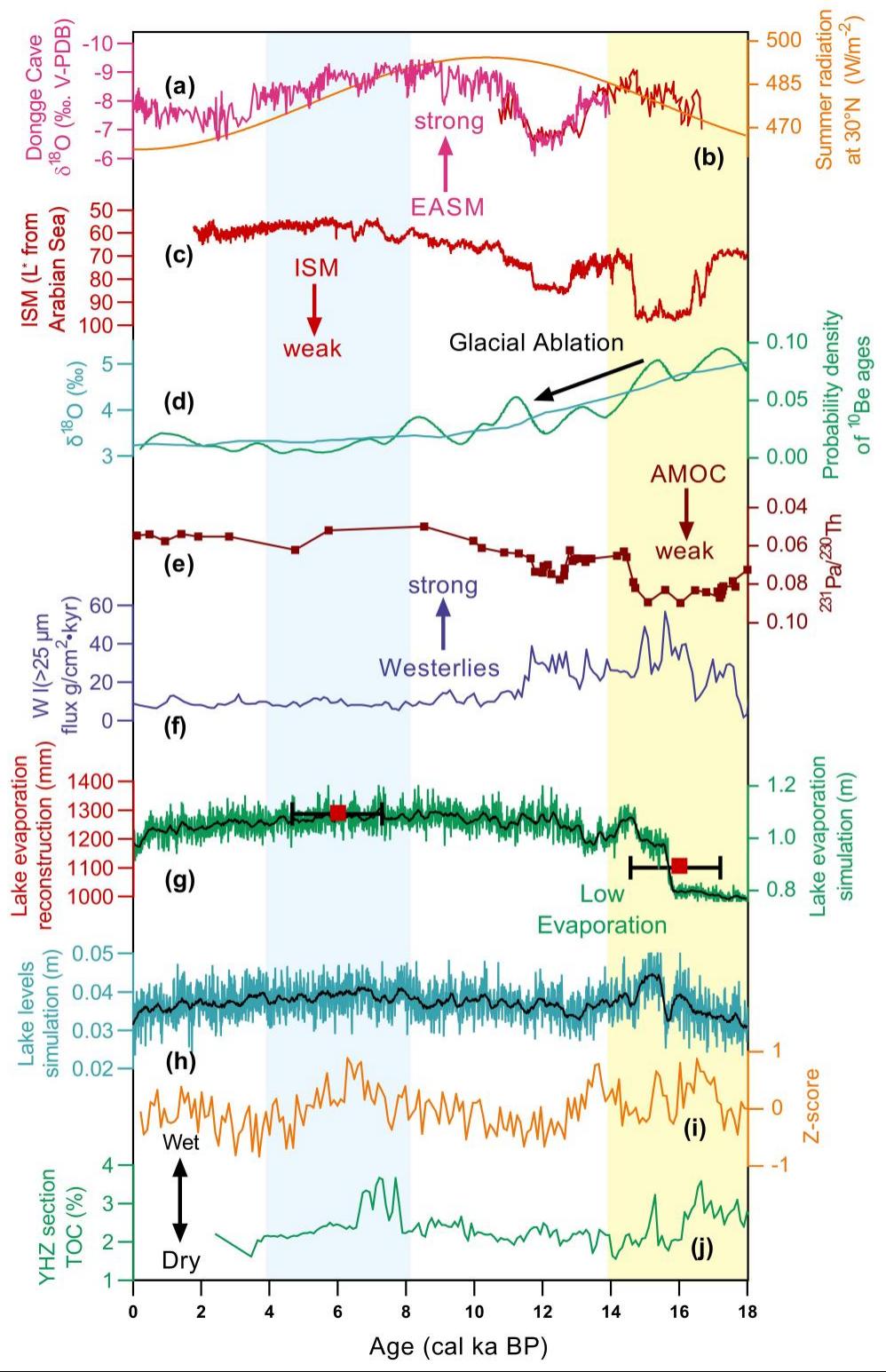 机制分析表明,中全新世湖泊扩张主要受夏季风降水增强控制;末次冰消期高湖面则并非单一因素所致,而是冰川融水补给、夏季太阳辐射增强及蒸发减弱共同作用的结果。在此基础上,研究进一步提出:末次冰消期北大西洋淡水输入增加可能增强了北半球冬季温度梯度,进而加强西风环流并提高冬季降水,对青藏高原湖泊“双峰模式”的形成发挥了重要作用(图4)。该研究深化了对青藏高原湖泊演化过程及其驱动机制的认识,也为理解高原气候系统及区域水文变化提供了新的证据。