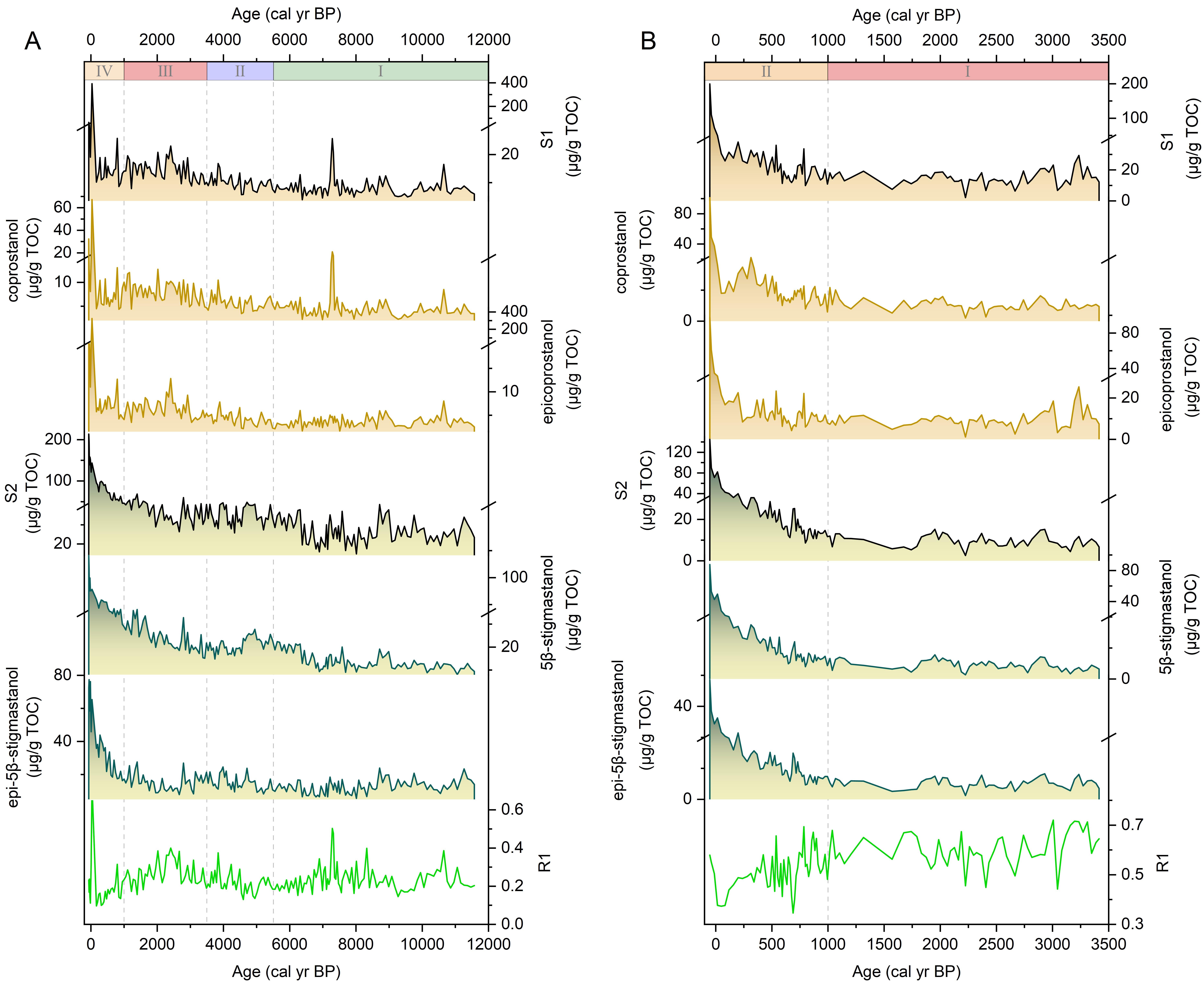 图2 全新世央英错(A)和碧湖(B)的粪便甾醇指标变化